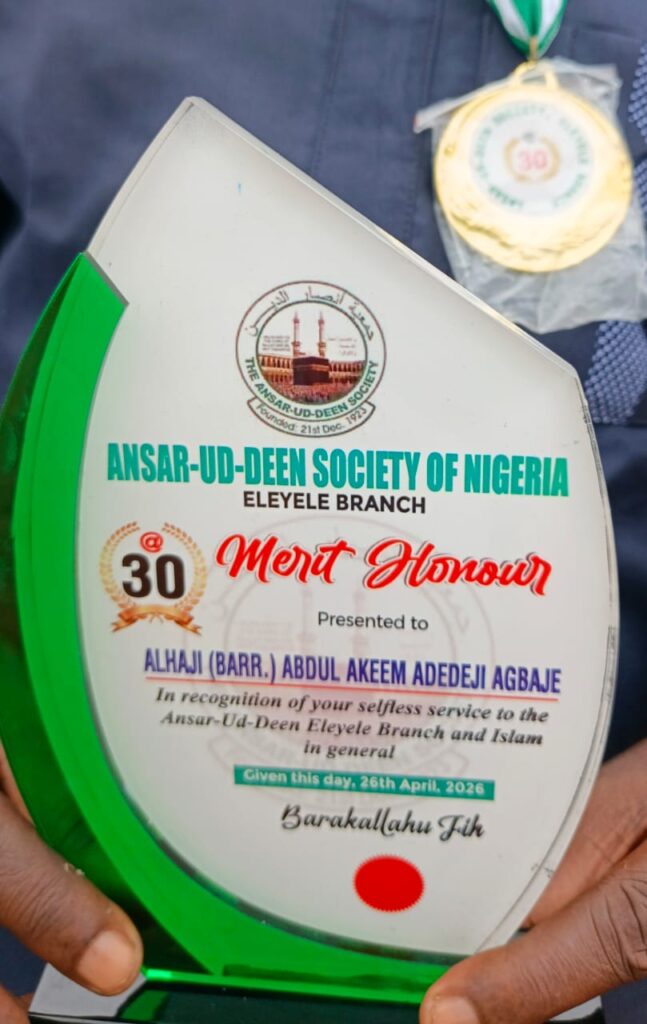 For his high intellectual prowess and enduring commitment to social welfare and human capacity development, Barrister Akeem Adedeji Agbaje, a prominent legal practitioner and an Oyo State governorship aspirant in the All Progressives Congress (APC), has been honoured by the Ansar-Ud-Deen Society of Nigeria, ADS, Eleyele Branch, Ibadan Oyo state.